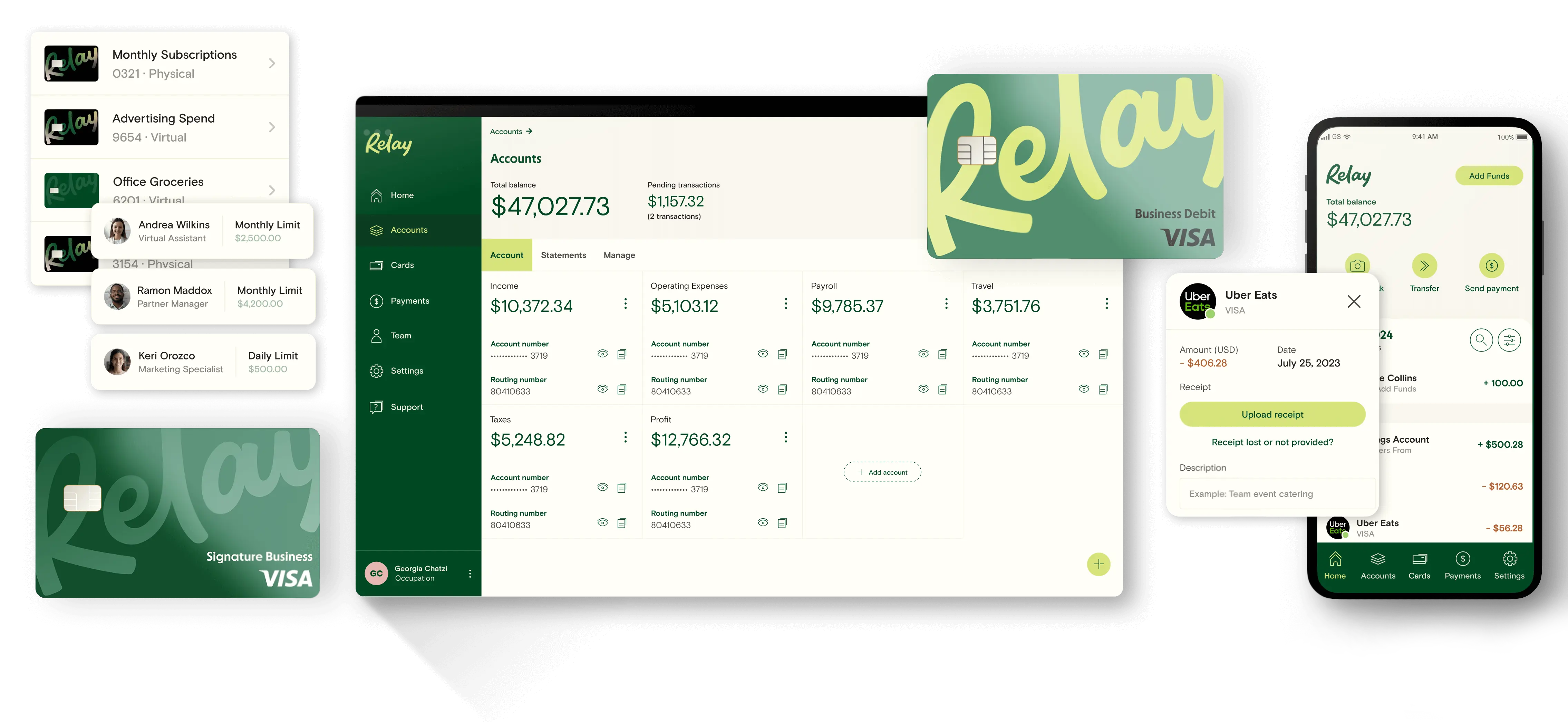 Relay is a financial technology company and is not an FDIC-insured bank. Banking services provided by Thread Bank2, Member FDIC. FDIC deposit insurance covers the failure of an insured bank. Certain conditions must be satisfied for pass-through deposit insurance coverage to apply. The Relay Visa® Debit Card is issued by Thread Bank, member FDIC, pursuant to a license from Visa U.S.A. Inc. and may be used anywhere Visa debit cards are accepted. The Relay Visa Credit® Card is issued by Thread Bank, Member FDIC, pursuant to a license from Visa U.S.A. Inc and may be used anywhere Visa credit cards are accepted.